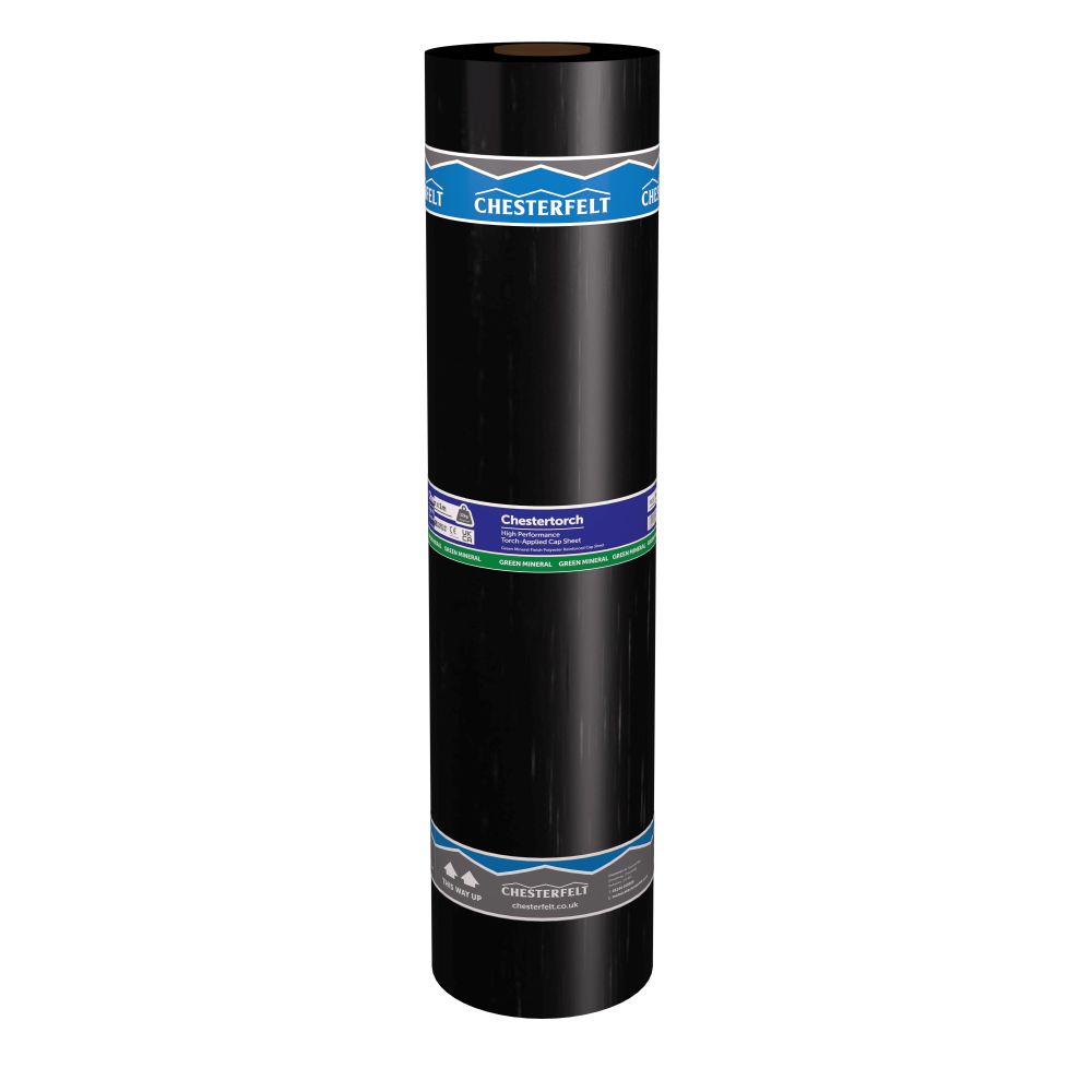 The CHESTERTORCH POLYESTER 8mx1m GREEN MIN. FINISH is a roofing membrane designed to provide weather protection within roofing systems.