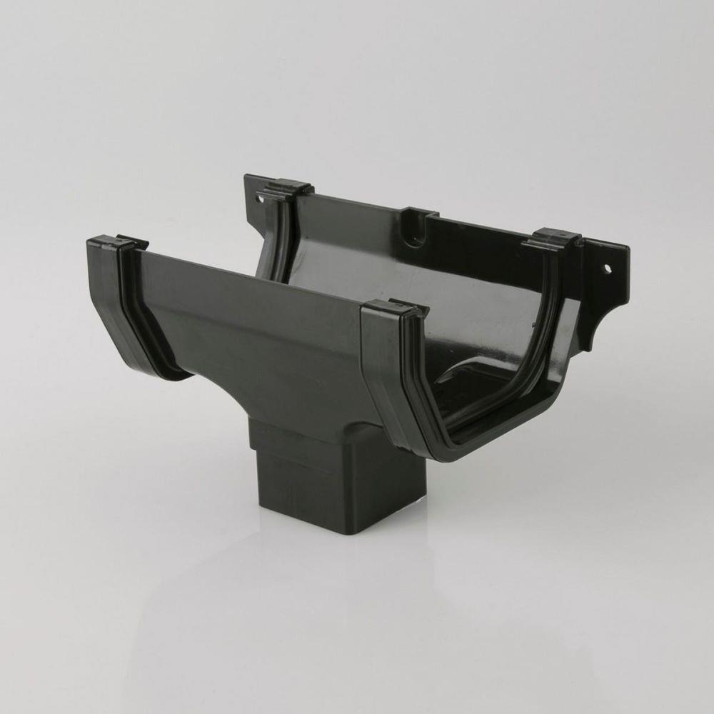 The Squarestyle running outlet provides the connection point between the 114mm square gutter system and the vertical rainwater downpipe. Installed between two gutter sections, it allows collected rainwater to flow efficiently from the roofline into the drainage system.