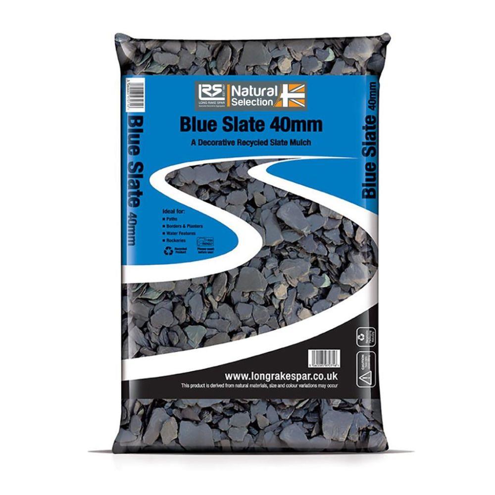 The Long Rake Spar Welsh Slate Blue 40 mm Poly Bag is a premium decorative aggregate manufactured by Long Rake Spar, showcasing distinctive blue and grey tones with natural variation typical of genuine Welsh slate. Its larger size and flat, angular profile create a bold, textured finish, making it ideal for feature landscaping and statement areas.